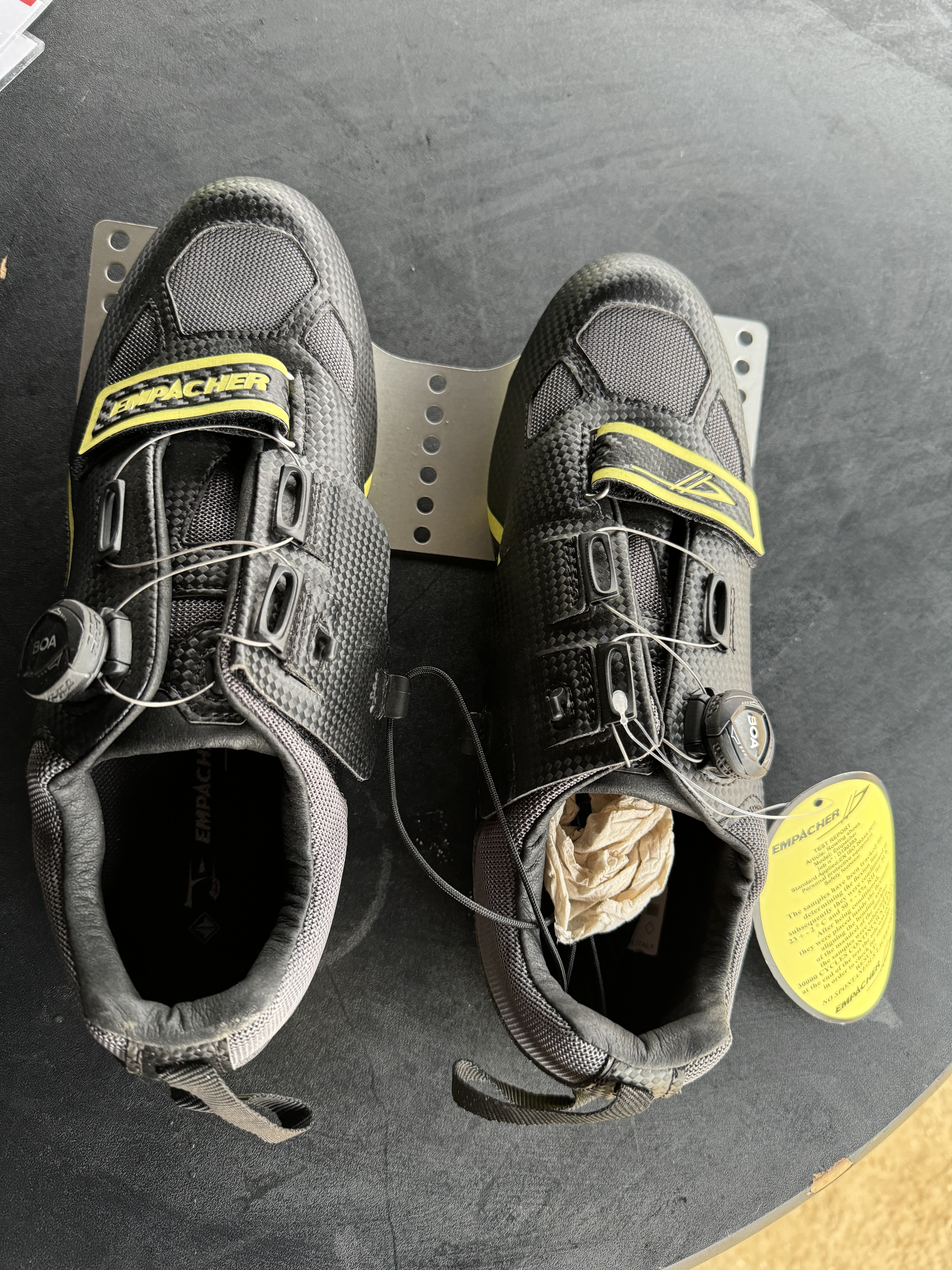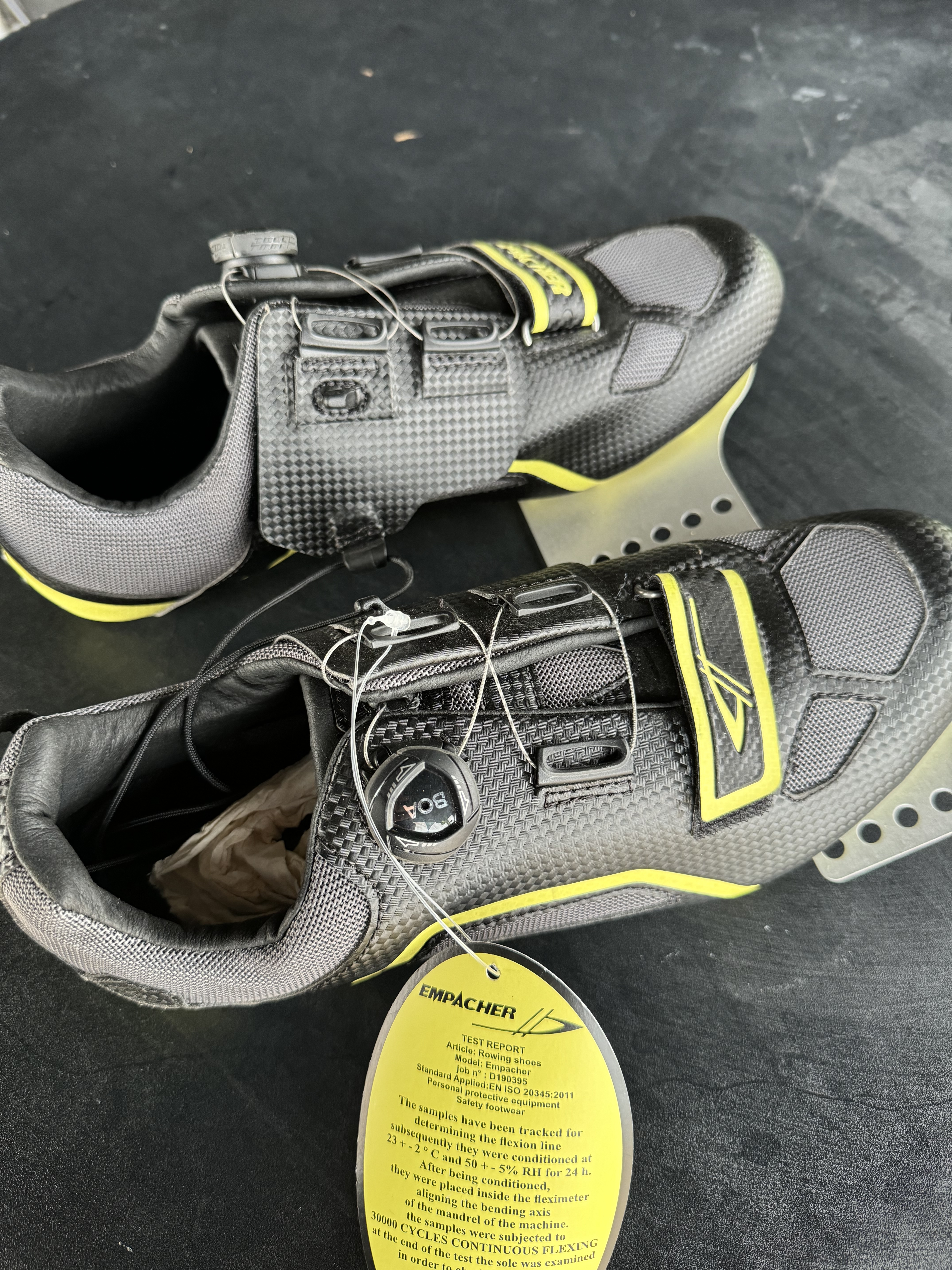 Les chaussures pour bateau d’aviron sont noires et jaunes, de marque Empacher. Montées sur une plaque en aluminium d’entraxe 250, 3 points de fixation, elles s’ajustent sur la plupart des planches de pied actuelles.